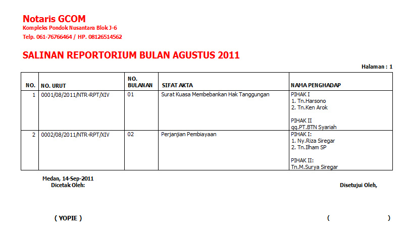 Aplikasi Administrasi Notaris dan PPATDibaca: 6274 kaliProgram Aplikasi Administrasi Akte Notaris dan PPAT - Cocok Untuk Pendataan Akte Reportorium, Legalisasi, Waarmerking Notaris dan PPAT Fitur Program Aplikasi Administrasi Notaris dan PPAT :