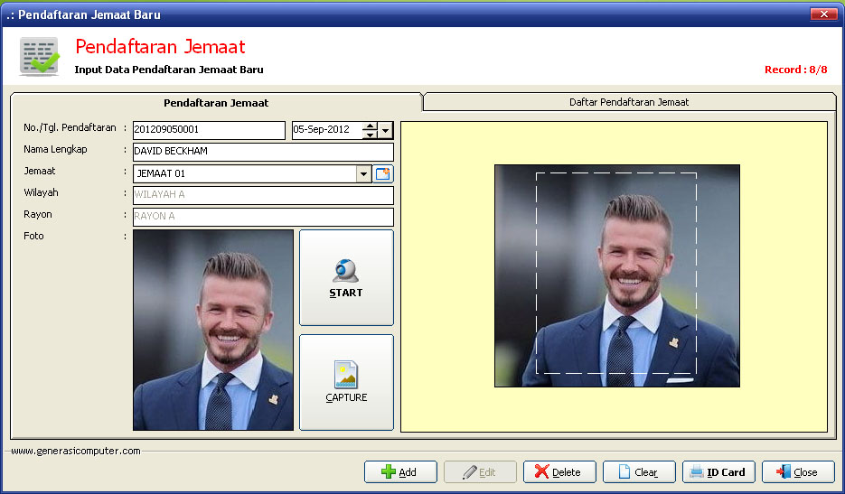 Aplikasi Administrasi Pendaftaran JemaatDibaca: 2628 kaliSoftware Program Aplikasi Pendaftaran Jemaat Gereja - aplikasi pendaftaran jemaat ini sangat cocok untuk pendataan jemaat baru, selain harga terjangkau aplikasi ini sangat mudah digunakan, bisa ambil dan crop foto via webcam dan cetak ID card. Silahkan hubungi kami di 08126514562 Fitur Program Aplikasi Administrasi Pendaftaran Jemaat :