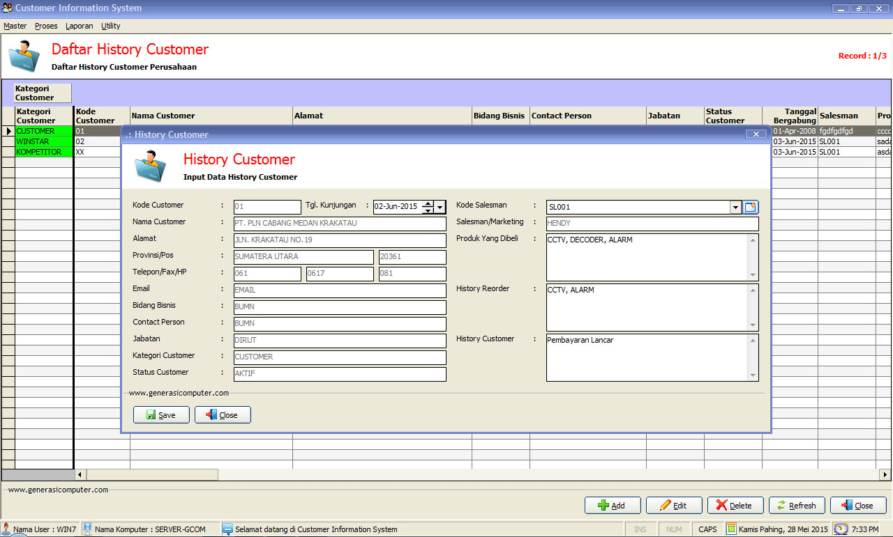 Aplikasi CustomerDibaca: 3318 kaliProgram Aplikasi Customer List - aplikasi history customer ini sangat cocok untuk menangani daftar customer aktif/lepas/blacklist/kompetitor. Fitur Program Aplikasi Customer :