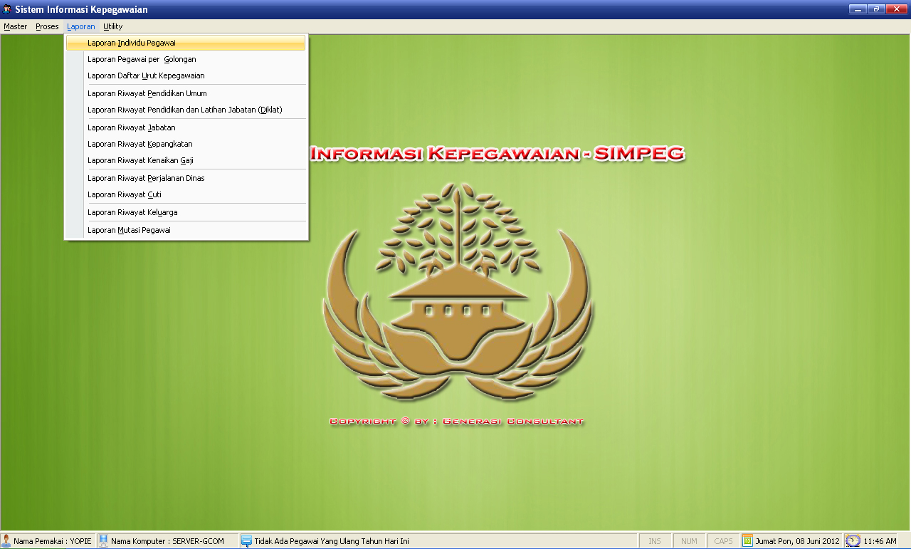 Aplikasi Kepegawaian SIMPEGDibaca: 3507 kaliProgram Aplikasi Sistem Informasi Manajemen Kepegawaian - aplikasi simpeg ini sangat cocok untuk instansi pemerintah yang kesulitan dalam menangani data pegawai. Aplikasi sangat mudah digunakan. Silahkan hubungi kami di 08126514562 Fitur Program Aplikasi Kepegawaian SIMPEG :