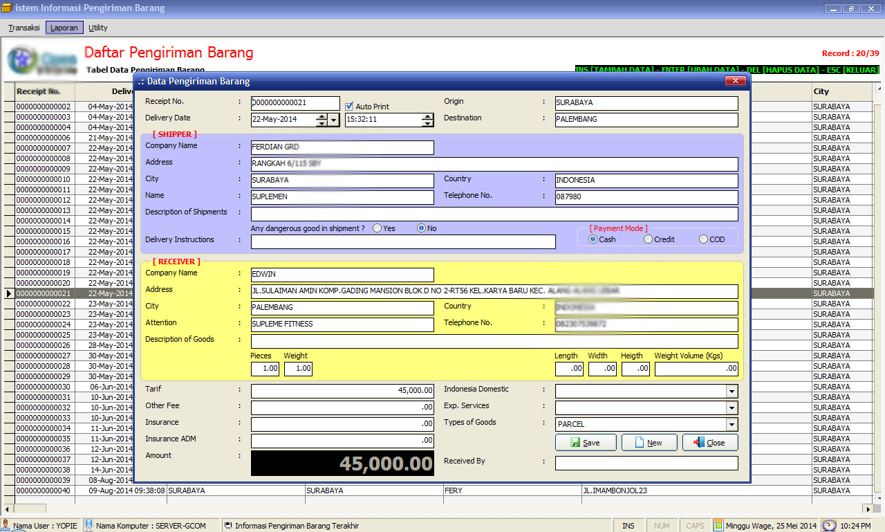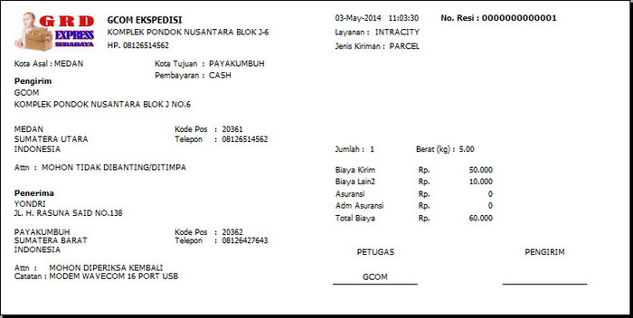 Aplikasi Pengiriman Barang EkspedisiDibaca: 7599 kaliProgram Aplikasi Pengiriman Barang - Program Aplikasi Ekspedisi Barang sangat cocok sebagai alat bantu usaha jasa pengiriman barang baik perorangan maupun lainnya seperti sub agen JNE, sub agen TIKI dll dalam pengolahan data pengiriman barang. Fitur Program Aplikasi Pengiriman Barang Ekspedisi :