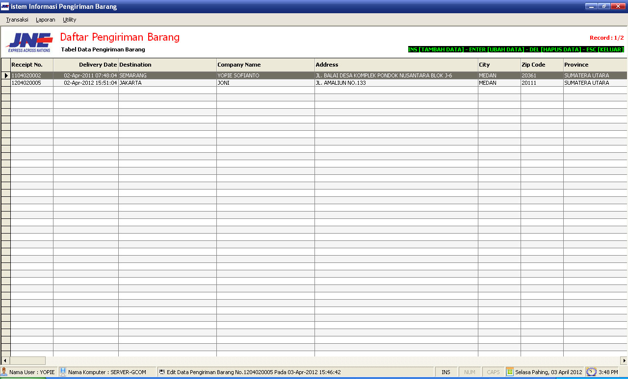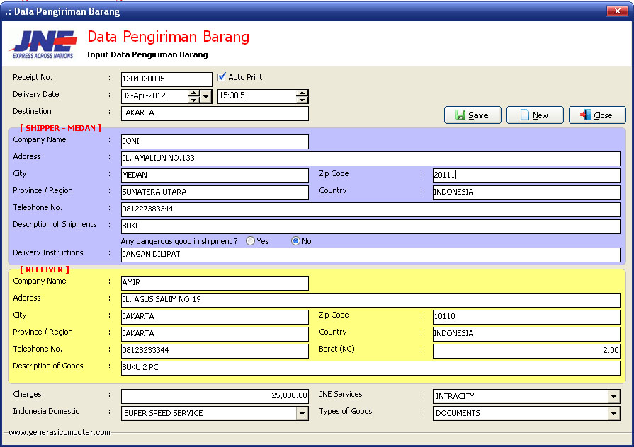 Aplikasi Pengiriman Barang JNEDibaca: 7663 kaliProgram Aplikasi Pengiriman Barang JNE/Tiki - Sangat cocok alat bantu sub agen jasa pengiriman barang seperti JNE, TIKI dll dalam pengolahan data pengiriman barang. Fitur Program Aplikasi Pengiriman Barang JNE :