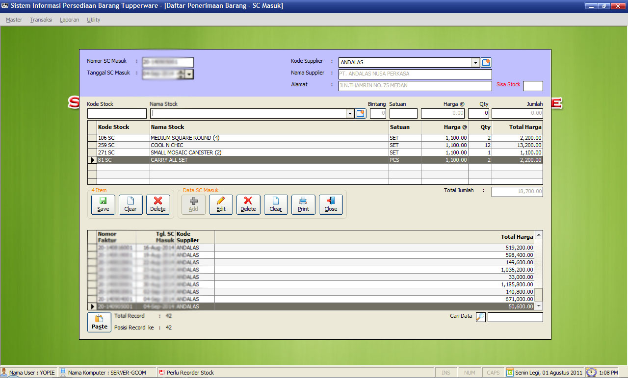 Aplikasi Persediaan Barang MLM TupperwareDibaca: 3236 kaliProduk Regular/Bintang/Hadiah, Pembelian, Penjualan, Retur, Barter Produk Sesama GM, Hitung Bonus/Voucer/Bintang, Hutang/Piutang dll Fitur Program Aplikasi Persediaan Barang MLM Tupperware :