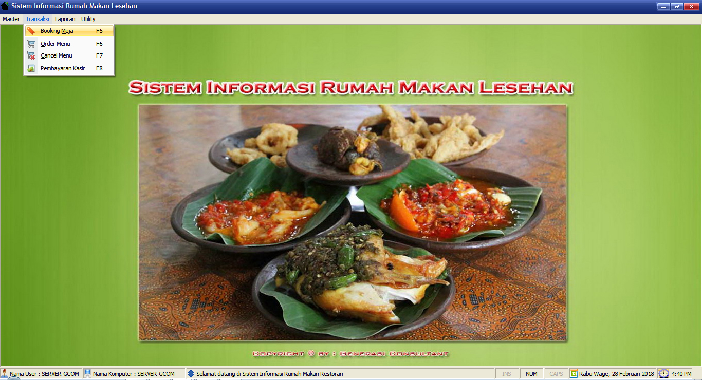 Aplikasi Rumah Makan LesehanDibaca: 2231 kaliSoftware Program Aplikasi Rumah Makan Lesehan - aplikasi restoran lesehan dengan sistem penjualan take away dan dine-in, support barcode reader dan foto produk, dengan harga terjangkau dan sangat mudah digunakan. Silahkan hubungi kami di 08126514562 Fitur Program Aplikasi Rumah Makan Lesehan :