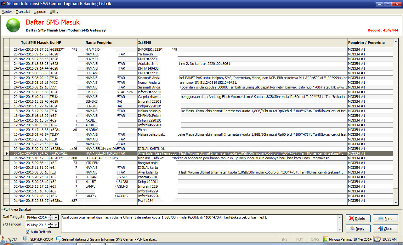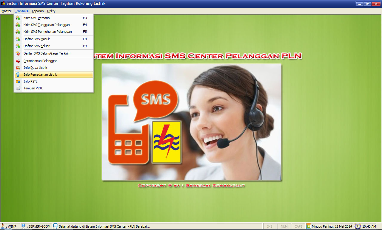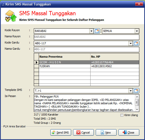 Aplikasi SMS Center Pelanggan PLNDibaca: 2786 kaliAplikasi SMS Center Pelanggan PLN sangat cocok sebagai pengingat tagihan jatuh tempo rekening listrik, undangan rapat, pendaftaran nomor hp pelanggan, info jadwal pemadaman listrik dll. Fitur Program Aplikasi SMS Center Pelanggan PLN :