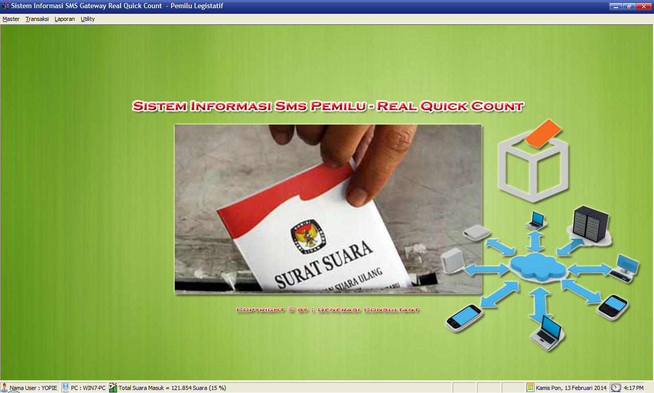 Aplikasi SMS Gateway Pemilu PILPRESDibaca: 2757 kaliSoftware Program Aplikasi Real Quick Count SMS Gateway Pemilu Presiden - Aplikasi SMS Gateway Pilpres ini sangat cocok untuk proses cepat perhitungan suara pemilihan presiden. Silahkan hubungi kami di 08126514562 Fitur Program Aplikasi SMS Gateway Pemilu PILPRES :