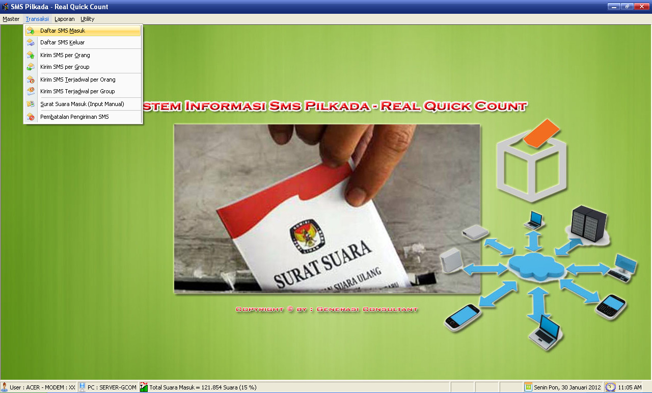 Aplikasi SMS Gateway PilkadaDibaca: 3231 kaliSoftware Program Aplikasi Real Quick Count SMS Gateway Pemilu Kepala Daerah - Aplikasi SMS Gateway Pilkada ini sangat cocok untuk proses cepat perhitungan suara pemilihan kepala daerah. Silahkan hubungi kami di 08126514562 Fitur Program Aplikasi SMS Gateway Pilkada :