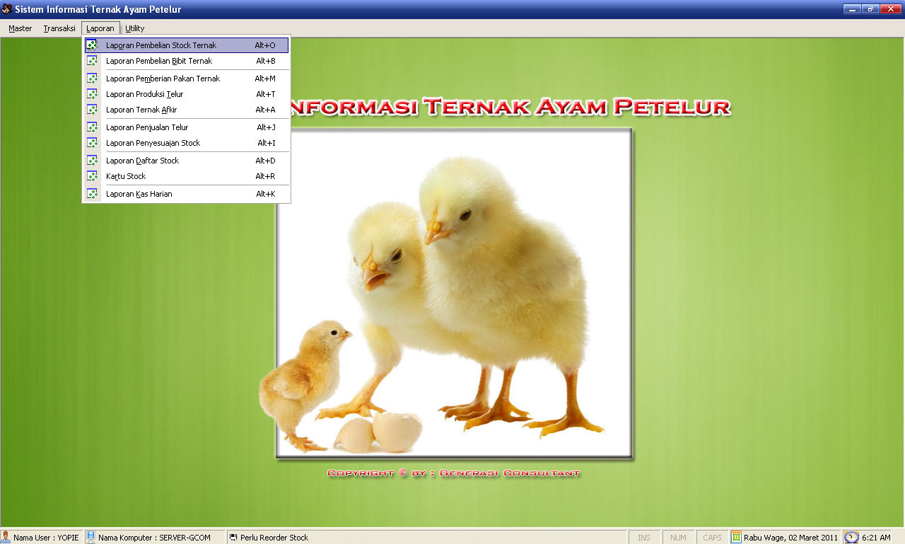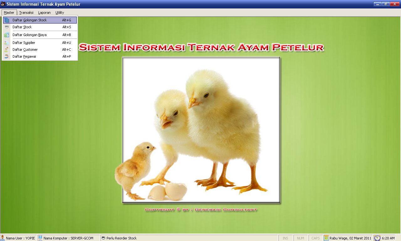 Aplikasi Ternak Ayam Pedaging atau BroilerDibaca: 4730 kaliSoftware Program Aplikasi Ternak Ayam Pedaging atau Broiler - aplikasi ini sangat cocok untuk pengusaha ternak ayam pedaging/broiler yang mengalami kesulitan dalam pencatatan data transaksi sehari-hari. Fitur Program Aplikasi Ternak Ayam Pedaging atau Broiler :