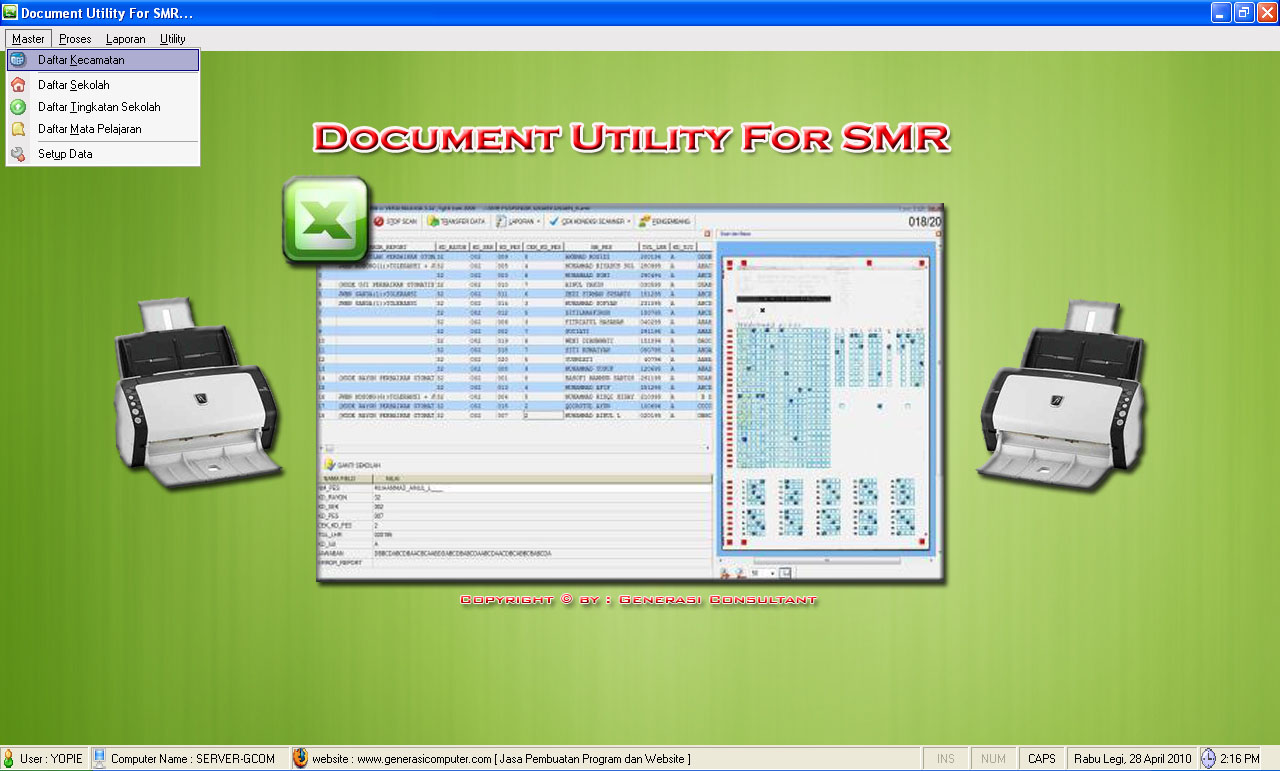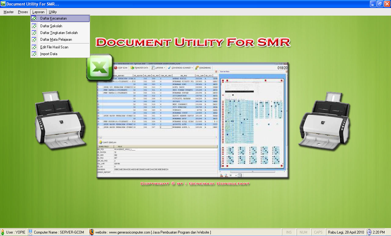 Utility For SMR DocumentDibaca: 3045 kaliProgram Aplikasi Utility For SMR Document - aplikasi scanner lembar jawaban komputer ini sangat cocok untuk perusahaan yang menyediakan jasa scan hasil ujian nasional. Aplikasi ini dapat memformat ulang hasil scan LJK dengan border dsb, selain harga terjangkau aplikasi ini sangat mudah digunakan. Silahkan hubungi kami di 08126514562 Fitur Program Utility For SMR Document :